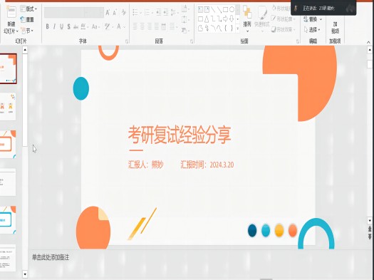 接着,23届考研上岸学生代表熊妙根据自己的亲身经历,分享自己的考研经验。她主要介绍复试准备工作及面试的技巧,分享面试中可能遇到的问题,干货满满。