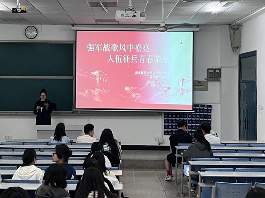 活动伊始,来自文学院2107班退役学生代表覃鲁、谢娟、李君涛、和石志强四位同学依次分享了在部队的切身经历与真实感受,并从大学生征兵的政策、应征入伍条件、报名流程、注意事项、参军入伍优势、职业发展、优抚优待、就业升学等方面进行了全面分析和解读。