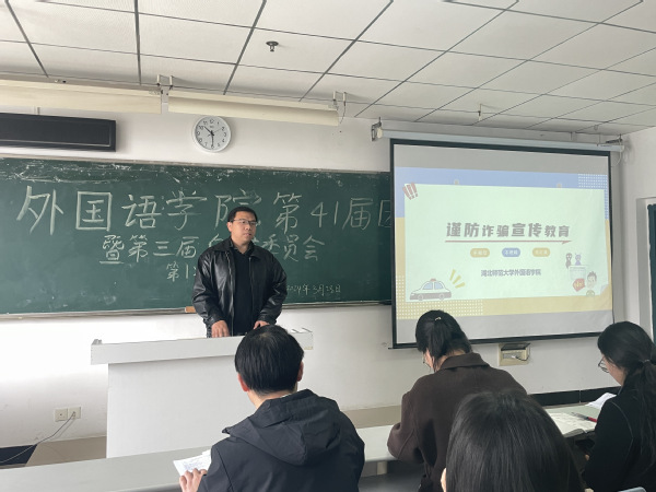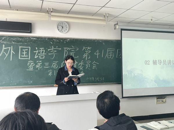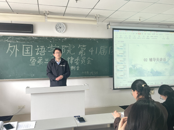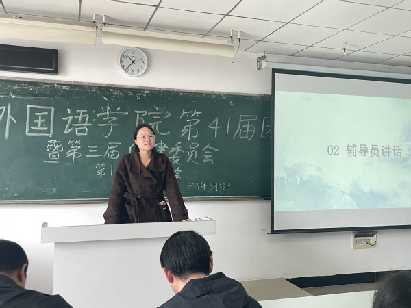 接下来,由辅导员进行讲话,他们对各部门的工作总结作了简单的反馈,并针对某些具体问题提出了相关的建议。朱玉琳老师就此次退役学生名单统计事件提出了相应的要求和建设性意见;罗兰老师着重介绍了外国语学院新设置的“心语信箱”,并提出开设一个新的QQ号以便在保证同学们隐私的情况下回复同学们反馈的相关问题;何俊生老师强调要注意典型诈骗和校园安全,提醒大家要关注电瓶车上牌问题;关巧老师提醒同学们注意活动要精简,协调好工作与学习;黄志军老师就各部门的发展提出了相应的要求,部门活动的安排以及部门今后的规划。相信辅导员们的建议与指导能够更好地帮助团学青各个部门很好地完成自己的工作,使团学青队伍不断壮大,增强团队凝聚力。