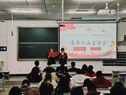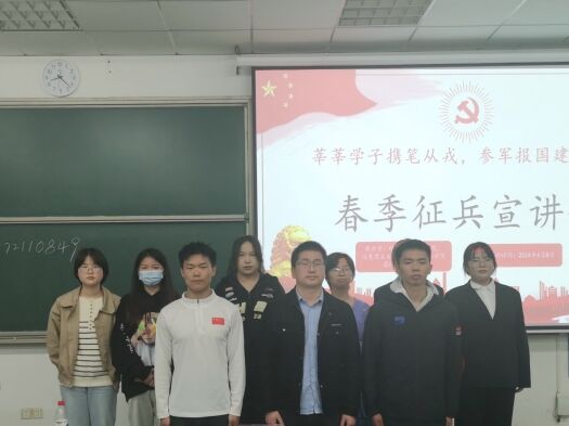 为激发大学生参军报国的热情,号召青年学子携笔从戎、建功军营,经济管理与法学院、马克思主义学院和化学化工学院退役学生服务部于4月8日在科技大楼9602举办了“莘莘学子携笔从戎,参军报国建功立业”春季征兵宣讲会。经济管理与法学院辅导员王润应邀出席。