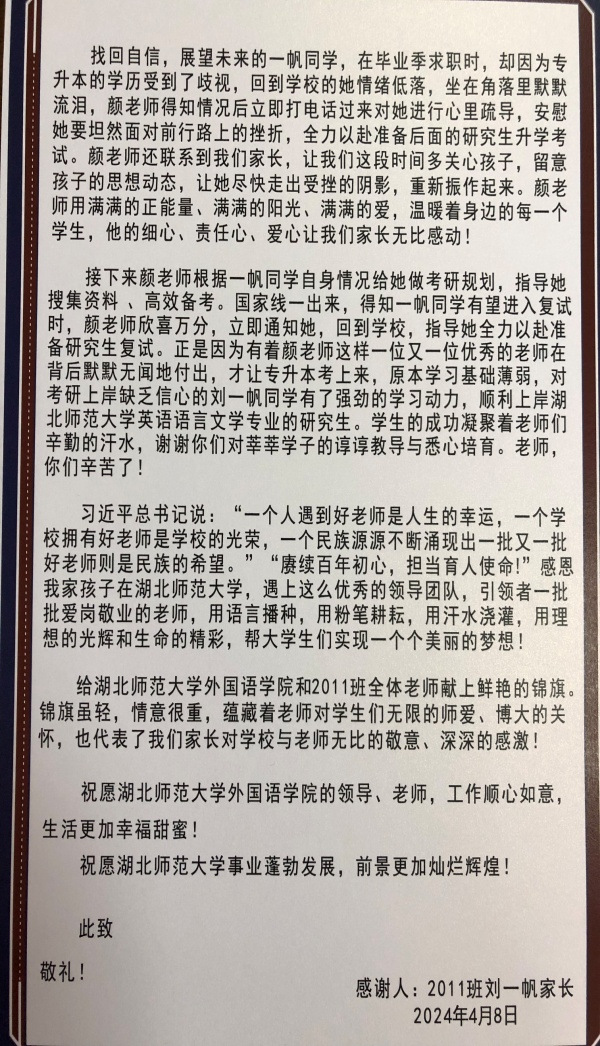 在座谈会的最后环节,刘一帆家长向外国语学院赠送了锦旗和感谢信。外国语学院党委书记王海燕向家长对学院工作的高度认可与信任表示了诚挚的谢意。她表示,学院将继续加强家校联系,不断优化教育教学环境,为学生的全面发展创造更加有利的条件。