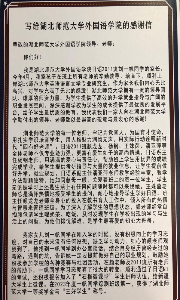 此次学生家长来校访问,标志着外院在家校协同育人道路上迈出了更加坚实的一步。外国语学院将以此为契机,不断加强与家长的沟通与交流,共同为学生营造更加良好的成长环境,为推动“家校协同育人”工作的有效实践提供更多湖师经验。