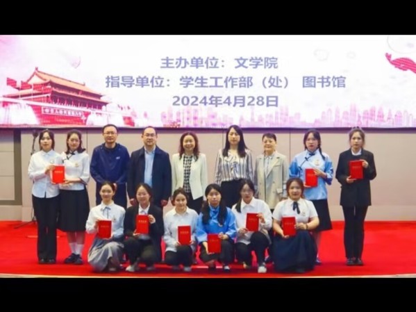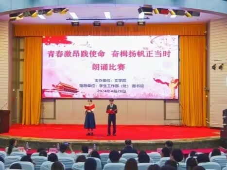 春风情深意暖,花海流溢飘香。为进一步传承中华优秀传统文化,活跃校园文化生活,展现新时代青年的青春风貌。4月28日晚,文学院于教育大楼报告厅举办“青春激昂践使命,奋楫扬帆正当时”朗诵比赛。学工部部长李洁,校图书馆馆长易桂姣,文学院党委书记车录彬、党委副书记郭笑笑、副院长杨文军担任此次比赛评委, 300余名同学观看比赛,此次比赛由2303班张璐和2305班冀锦鹏主持。