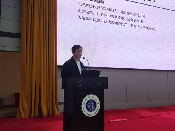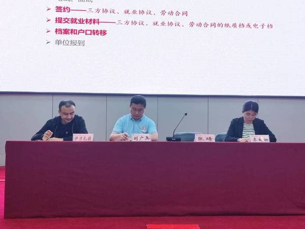 会议中,学院辅导员根据分工安排依次进行讲解。一是讲清楚就业基本流程以及相关注意事项,针对签约环节中容易出现的三方协议信息不完整、单位名称和公章不一致等问题隐患作出安全提醒。二是讲清楚毕业去向登记和档案派遣相关事宜,提醒毕业生及时核对生源地信息,注意档案派遣去向的区别和要求。三是讲清楚党团组织关系转接的相关要求,及时配合相关部门完成转接工作。