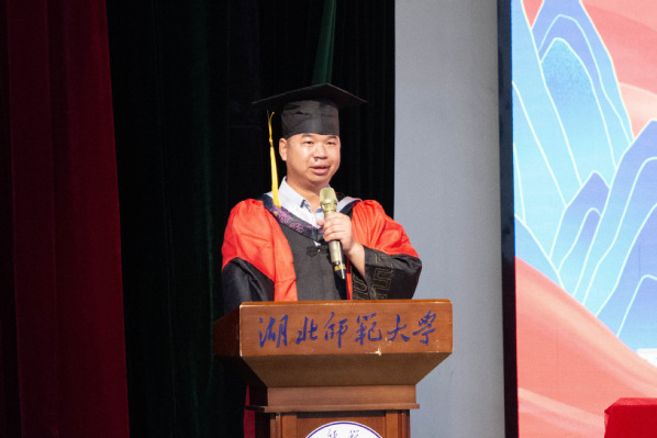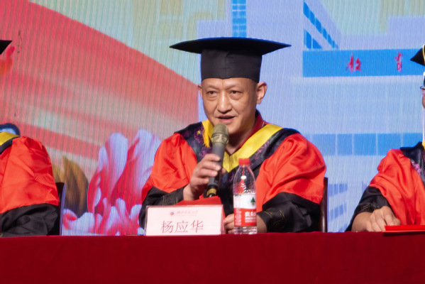 10点整,毕业典礼在庄严雄壮的国歌声中拉开了序幕。学院党委书记杨应华致辞,他代表学院向299名本科生和19名硕士研究生圆满完成学业表示热烈祝贺,对毕业生们提出了希望:一是以主动精神追寻人生的航标,成为一个因为主动而内心安宁的人;二是以人文情怀去从容求索,希望同学们身上奔涌着前辈学者的精神血脉,虽不可见,却实际拥有着绵延不息的伟力。最后,他深情地嘱托同学们在努力拼搏,同时绑定电子校友卡,常回家看看。