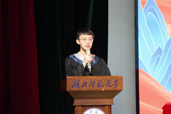 毕业生代表周定通同学回顾了自己的求学经历和感悟,分享了四年时光的点点滴滴,感谢学院、老师和同学们对自己的支持和帮助,并表达对学院及同学们的美好祝愿。