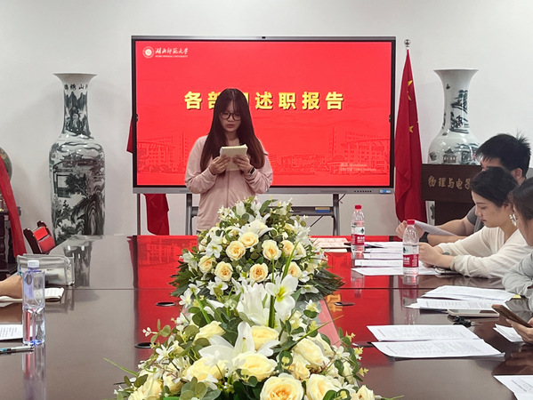 5月17日中午,2023-2024学年物理与电子科学学院学生会、自律委员会换届大会在信息大楼10508会议室顺利举行,参与本次会议的有学院辅导员田学泽、吕璐,学生会主席王智敏、副主席韦笑,自律委员会主席徐爽、副主席孙菲及学生会、自律委员会全体学生干部。会议由秘书部干事鲜于东晨主持。