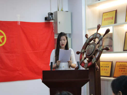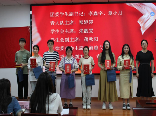 紧接着,与会领导老师为即将卸任的学生干部颁发聘书和纪念品并合影留恋。屈媛媛老师上台宣读第四十一届团委、学生会和第四届自律委员会学生干部名单,并对相关工作做了细化要求。第四届自律委员会主席郑梓榮代表新一届全体学生干部承诺,要践行“为同学服务”宗旨,做好学生成长的领头羊和学生工作的排头兵。