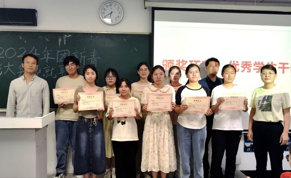 表彰大会上,陈洋、吴鸿杰分别宣读了2023-2024学年优秀部门名单和优秀学生干部名单,郭笑笑、邱天来、陈洋、董雅芳、吴鸿杰为获奖同学颁奖并合影留念。陈洋、吴鸿杰对上一届学生干部的辛勤付出和卓越贡献表示肯定,希望他们继续关心、关注学院学生工作;对新一届当选的学生干部表示祝贺,希望新一届学生干部可以在已经取得的工作成绩基础上继续努力,再创佳绩。