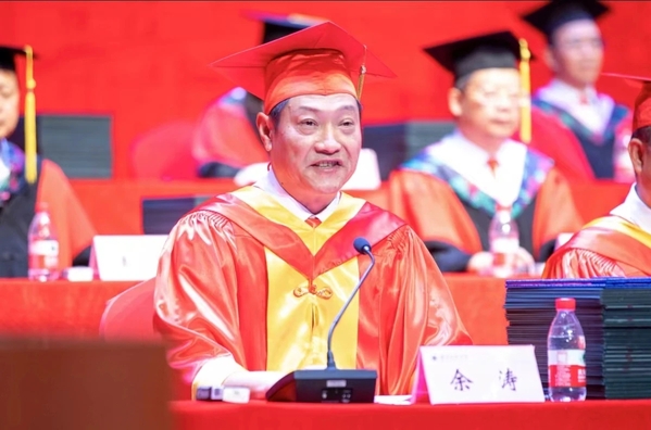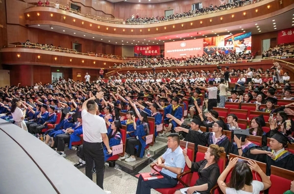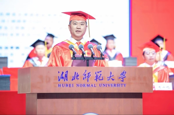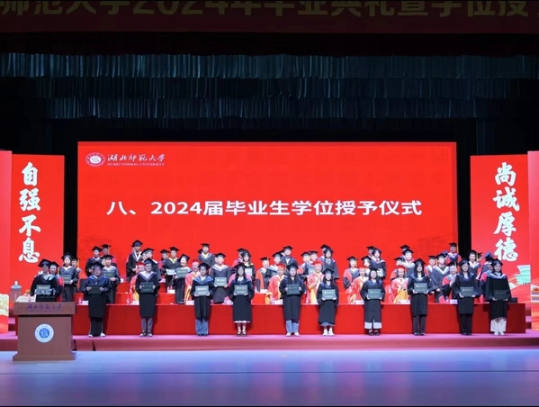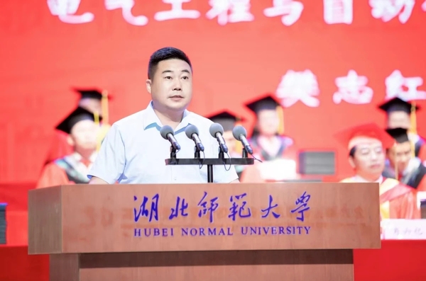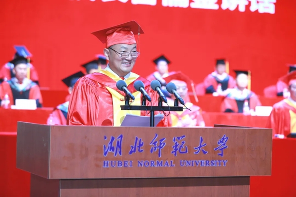 校长雷儒金以《挺膺担当再出发 激扬青春谱新篇》为题寄语全体毕业生。他代表学校向5247名本科生和550名硕士研究生圆满完成学业表示热烈祝贺。他谈到,同学们风华正茂、年富力强,应珍惜大好机遇,担当时代重任,在时代变革、强国建设、民族复兴伟业的宏伟征程中挥洒青春热血、书写精彩人生。对即将踏上人生新征程的同学们,他提出三点希望:一是希望同学们终身学习、不断创新,争当时代变革的弄潮儿;二是希望同学们胸怀家国、志存天下,争当强国建设的生力军;三是希望同学们甘于吃苦、乐于奋斗,争当民族复兴的筑梦人。他希望广大毕业生秉承“诚、毅、勤、敏”的湖师校训,脚踏实地,坚持不懈,在奋斗中绽放最美姿态,在实干中践行最大担当,为实现中华民族复兴伟业贡献湖师学子的青春力量。
