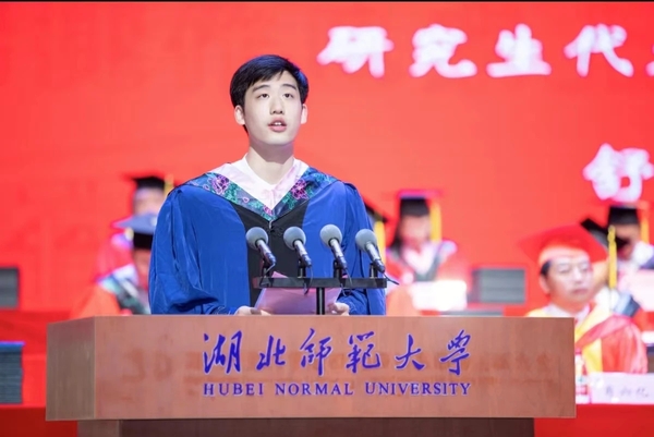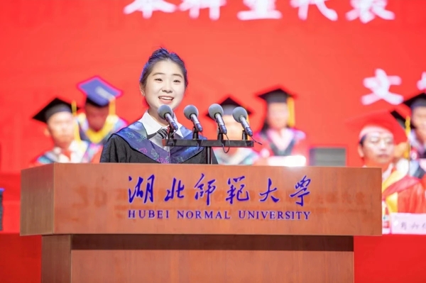 化学化工学院本科生文紫璇、文学院硕士研究生舒沛作为优秀毕业生代表依次发言。他们表达了对母校栽培的感恩之情,并表明会在今后的生活中以行动践行“自强不息,尚诚厚德”的湖师精神,继续书写丰富多彩的人生新篇章。