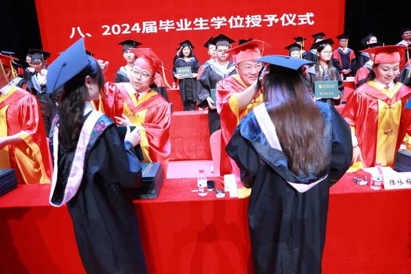 学位授予环节,全体校领导和学位评定委员会委员为现场所有毕业生代表逐一拨穗正冠,并颁发学位证书,共同见证同学们毕业礼成的喜悦时刻。