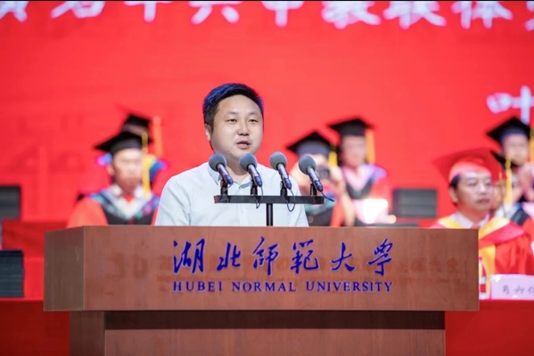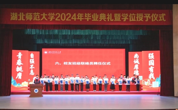 在校友班级联络员聘任仪式上,学校为联络员代表颁发聘书,未来又有147名毕业生成为校友与母校连结的桥梁纽带。随后,物电学院2004届校友,黄石十六中教联体党总支书记、总校长叶钊作为优秀校友代表发言。回溯过去,他表达了对母校的感恩之情。他以参加工作、走入社会的经历勉励同学们要始终做一个以母校为荣、坚守初心、能吃苦、敢担当的湖师青年。