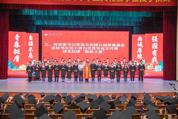 典礼在雄壮的国歌声中拉开序幕。校党委副书记马列军宣读2024届优秀毕业生表彰文件。校党委书记李宏与劲牌公益慈善基金会秘书长伍小勇共同为优秀毕业生代表颁发劲牌“勤敏之星”。