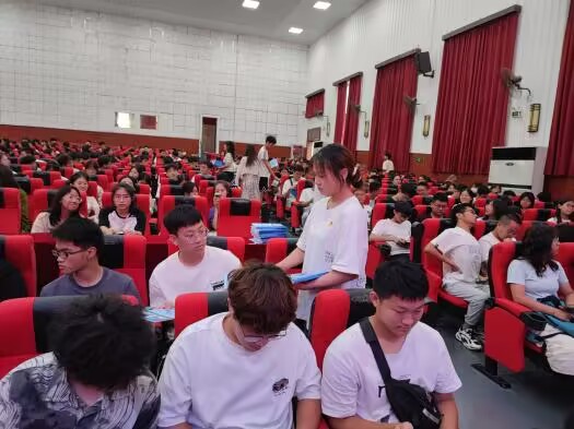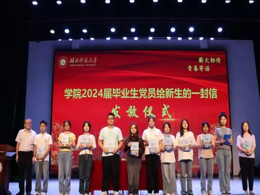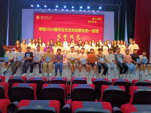 当日,在湖师大礼堂,学院党委书记罗鸿飞、党委副书记吴天真为各班代表发放书信汇编,学生党员在台下为其他学生发放。罗鸿飞在发放仪式上发表了简短的讲话,他表示,开展毕业生党员给新生写一封信的活动是学院党建工作的一个创新,是发挥党员模范带头作用、开展“传帮带”的一个重要途径。本书完整收录了今年毕业的43名本科生和研究生党员的感言、体会与心得,是他们对自己大学生活、研究生生活的回望总结,没有华丽的辞藻、说教式话语,有的只是学长学姐们真挚的情感和用朴实的语言书写的真实事情或生活学习片段。希望全体新生能从其中激发信仰、获得启发、汲取力量,早日明确自己的大学努力方向,努力成长为更好的自己!