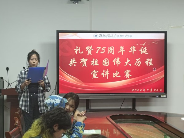 2024年9月26日,为庆祝祖国75周年华诞,回顾新中国成立以来取得的辉煌成就,展现国家的发展历程与人民生活的巨大变迁,教育科学学院青年传媒中心成功举办了一场以“礼赞75周年华诞,共贺祖国伟大历程”为主题的宣讲活动。出席此次活动的嘉宾包括教育科学学院辅导员秦姗姗老师、夏青腾老师,团委学生副书记许广昊,以及学生自律委员会主席刘晓浅。