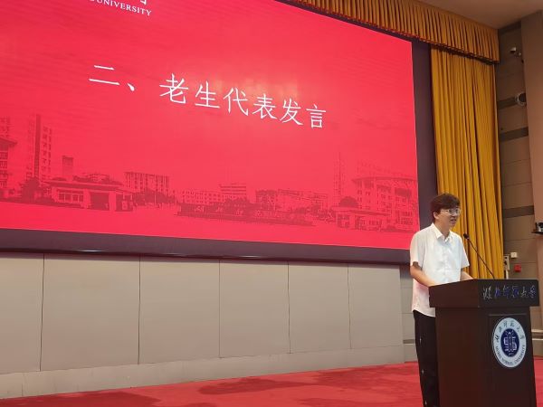 会议第二项,由老生代表、自委会主席侯学典发言。他向新生们分享了自己在大学期间的学习经验、生活感悟以及如何平衡学业与课外活动之间的关系。同时,他强调了诚信为本、深化交流和全面发展的重要性。侯学典的发言充满了真诚和热情,为新生们提供了宝贵的建议。
