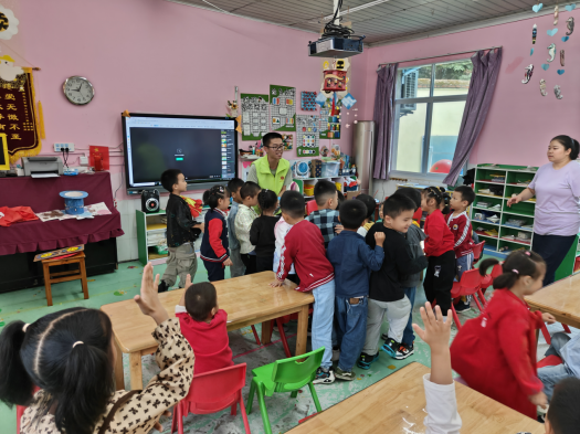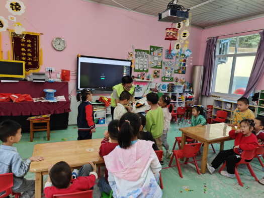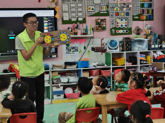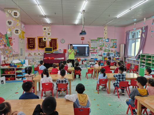 随后,宣讲人向小朋友们展示趣味立体手工书的构成与玩法,并邀请小朋友们抢答手工作品中图形名称,并随时互动,积极引导他们参与其中。
