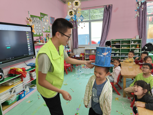 活动伊始,志愿者向小朋友们介绍数学手工作品的制作背景和意义,强调动手实践对于培养创新思维和团队协作能力的重要性,并向小朋友们展示了手工帽并邀请坐姿最端正的小朋友佩戴。