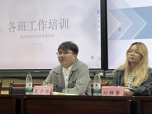 为进一步提升教育科学学院24级各班查课与课前十分钟工作的规范性,避免迟到旷到等现象,保证课前十分钟的有序开展,教育科学学院学风建设部会于11月4日中午在教育大楼1316A举办了班级工作培训会议。出席本次会议的有辅导员夏青腾、学生自律委员会主席团之一孙雅馨、学风建设部部长张文韬以及24级各班班长、学习委员和监察委员。