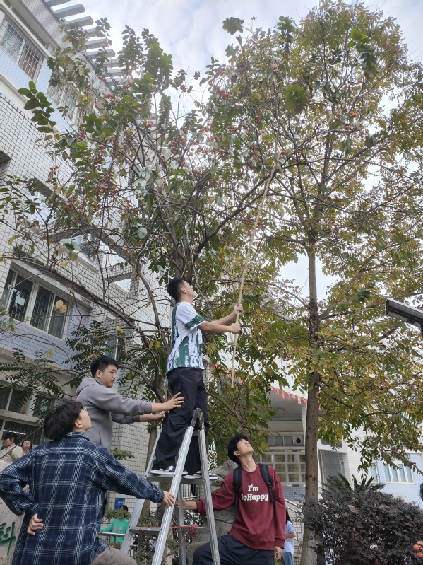 讲解结束后,在辅导员老师的精心组织下,同学们满怀期待地投身于柿子采摘活动中。他们或手持采摘器,或借助梯子和竹竿,兴致勃勃地采摘着挂满枝头的果实,在享受秋收喜悦的同时,也深刻体会到了劳动的价值与意义。