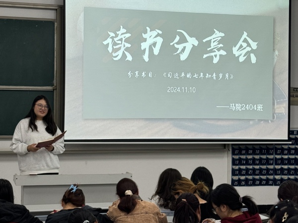 在读书分享会上,两位同学根据自己的研读成果进行了分享。首先,代维娜同学,从习近平总书记思想上的发展历程、与梁家河乡亲间深厚的情谊、为人民服务的生动实践三个方面进行了分享,生动介绍了习近平总书记的七年知青岁月,表明了梁家河经历对习近平总书记的意义非凡;接着,彭薇倪同学着重在文本内容特点和自身感受上进行了分享,从习近平在梁家河打井、修淤地坝等一幕幕场景中,真切地感受到那个时代的艰苦奋斗气息,聆听到了习近平七年知春岁月中的心声。两位同学都不约而同的指出,作为新时代的莘莘学子,应向青年时期的习近平看齐,奋楫笃行,不忘来时路,奔赴未来路。