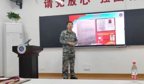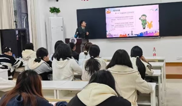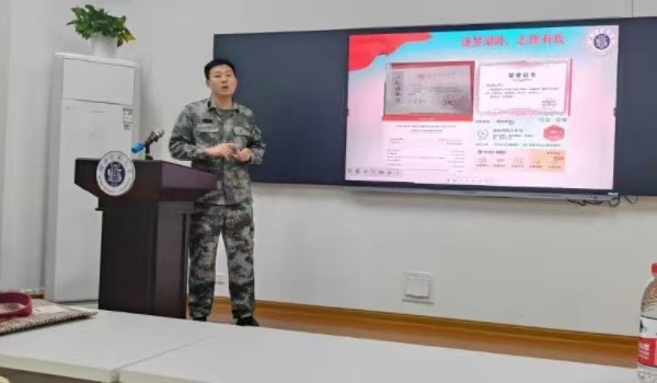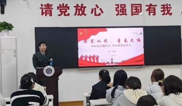 苏家鑫同学详细介绍了大学生应征入伍政策,介绍了参军的相关优待政策,特别是国家在学业、及退役后发展等方面的扶持帮助,鼓励同学们从校园走进军营施展才华,携笔从戎、建功军营,为国防和军队现代化建设注入新的活力。