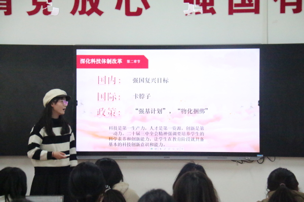 活动的第三环节,吴佳丽同学讲授“微团课”。她从教育、人才、科技体制改革三个方面出发,以独特的视角和生动的语言,阐述了教育、人才、科技协同发展的必要性,呼吁优师班同学细细领会党的二十届三中全会精神,深深体会国家对教育发展的长远大计。