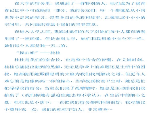 活动期间,同学们纷纷踊跃投稿,用细腻的笔触勾勒出与室友相处的点点滴滴。她们回忆初次见面时的青涩与好奇,向我们讲述备考期间室友间的鼓励与陪伴,分享生活中因琐事引发的小摩擦及和解后的温暖。字里行间,满是青春气息与深厚情谊,那些或欢笑、或感动、或争吵的画面,成为了校园生活里最难忘的回忆。