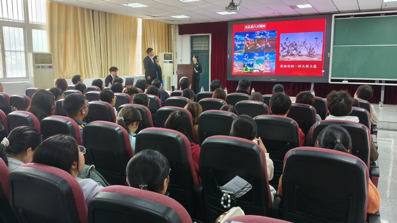 接下来,退役大学生士兵薛新怡为大家分享了她在军营的点点滴滴。从初入军营的懵懂无知,到逐渐适应并成长为一名优秀的士兵,再到退役后重返校园,勤奋学习,积极参与校园文化活动。她用真挚的语言、生动的细节,讲述了一段段感人至深的故事,让在场师生深刻感受到了军营生活的艰辛与荣耀,也更加坚定了大家的家国情怀和报国之志。