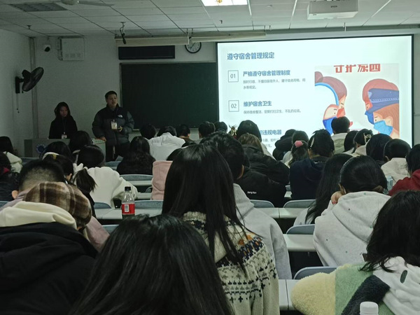活动伊始,贾林宇强调了宿舍安全的重要性,并提醒同学们要时刻保持警惕。他详细分析了宿舍安全可能面临的火灾隐患、盗窃风险和治安问题,并提出了相应的预防措施。在宿舍卫生和环境保护方面,贾林宇阐释了其重要性及维护方法。此外,他还强调了建立良好宿舍关系的必要性,并分享了构建和谐宿舍环境的有效策略。