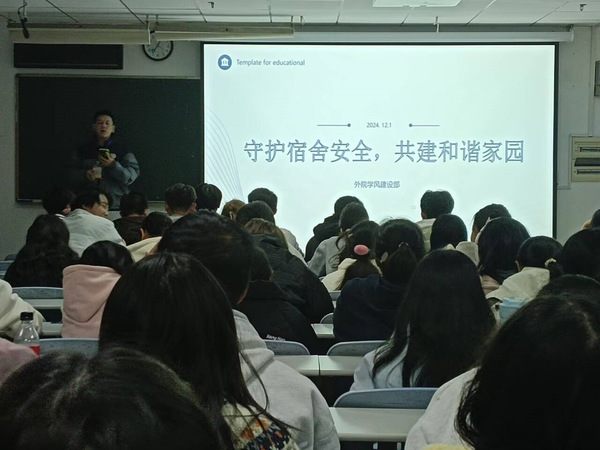 12月1日19时,yl23455永利官网外国语学院学风建设部在人文楼21B409室举办了“守护宿舍安全,共筑和谐家园”晚点名活动。此次活动旨在提升学生宿舍安全意识,营造良好生活环境,促进学生的身心健康,同时响应学校关于清理宿舍阳台易燃废弃物的倡议。学风建设部负责人杨梦妮、贾林宇精心组织,2402班与2403班全体同学积极参与。