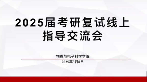 为扎实推进2025 届本科毕业生考研复试与调剂指导工作,助力考研学子精准掌握复试及调剂要求,3 月 8 日晚,物理与电子科学学院借助线上平台,成功举办了 2025 届学生考研复试经验分享会。研究生院吕剑老师、校内外优秀研究生代表与 2025 届考研学子齐聚线上,共同参与此次活动。活动由学院辅导员李双翼老师主持。
