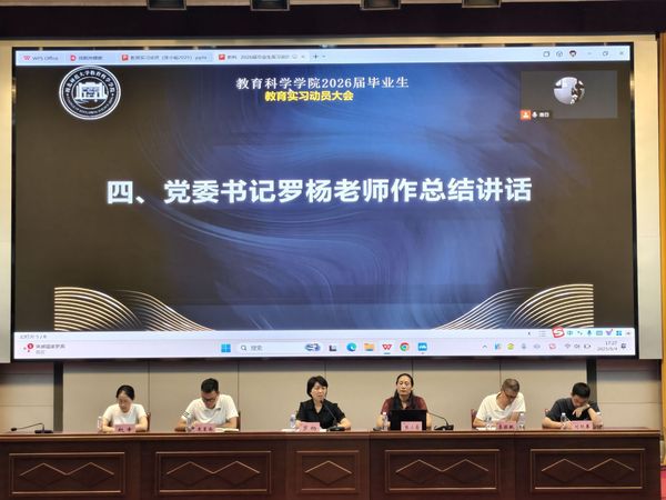 为明确实习任务目标,调动学生的实习积极性,保障教育实习工作的有序开展,9月4日下午,yl23455永利官网教育科学学院于教育大楼报告厅举行2026届毕业生实习动员大会。教育科学学院党委书记罗杨,副院长张小菊,指导教师代表马婷婷,2021级学生代表胡碟以及22级全体学生出席本次会议。教学办谭燕军老师担任大会主持人。