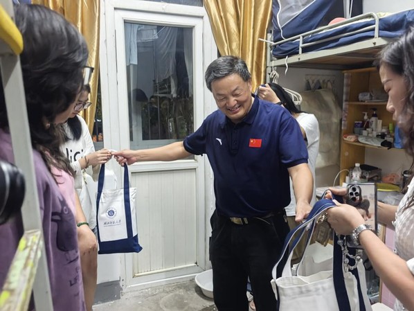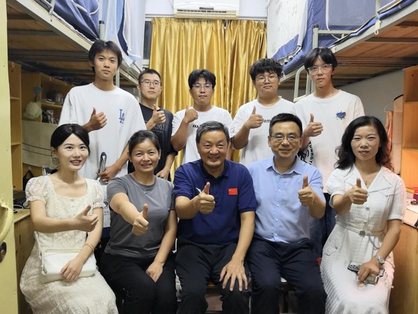 随后,雷儒金一行来到31栋新生宿舍,与同学们热情交谈。雷校长鼓励大家树立远大理想,尽快适应大学生活,扎实学好专业知识,努力成长为对国家和社会有贡献的栋梁之才。他叮嘱同学们要明确目标、做好规划,积极准备专业考试,在拼搏奋斗中实现人生价值。交流过程中,雷儒金还详细了解了同学们的生活需求,为新生送上了暖心大礼包,表达学校对他们的欢迎与关怀。