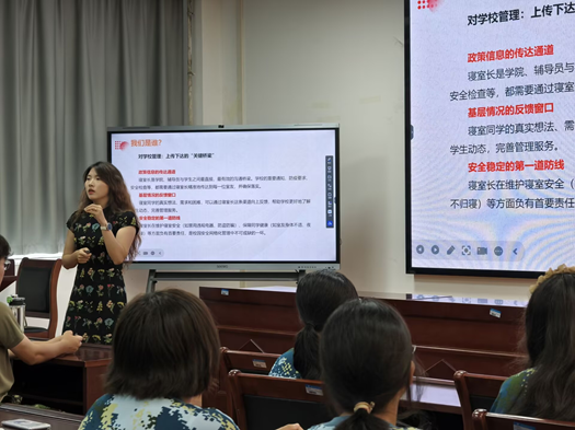 最后,屈媛媛老师强调寝室长不是一个“官”,而是一份“责任”,一座“桥梁”,更是一份“温暖”,呼吁全体寝室长将所学所感,转化为实际行动,经营好宿舍“小家”,共同创造和谐安全的校园。