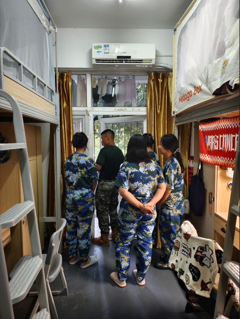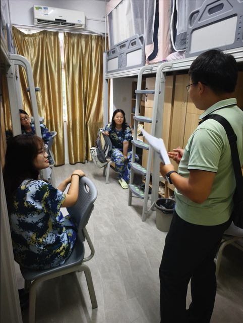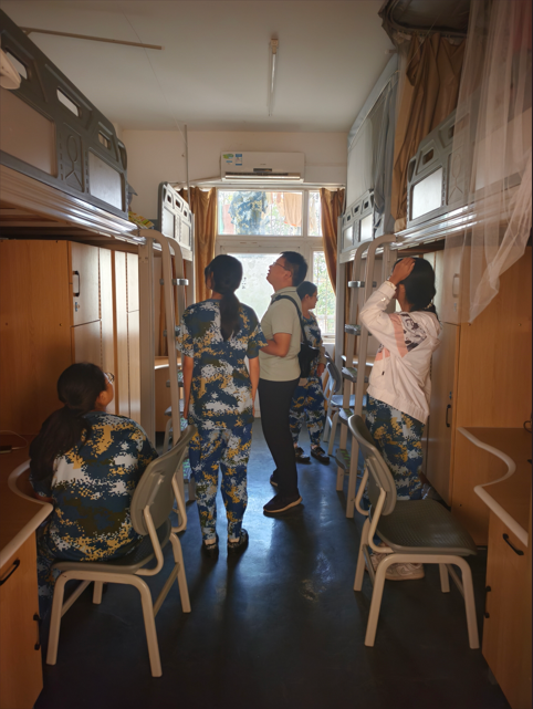 为精准掌握新生军训住宿情况,筑牢宿舍安全防线,助力新生以良好状态投入训练,近日,电气工程与自动化学院辅导员黄新望与军训教官深入新生宿舍,开展了一场严谨且温情的查寝工作。