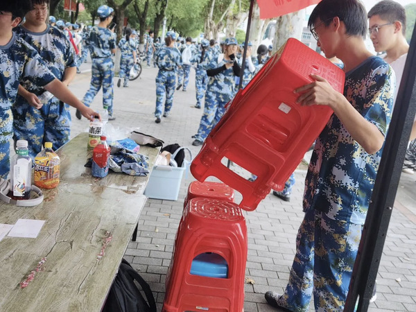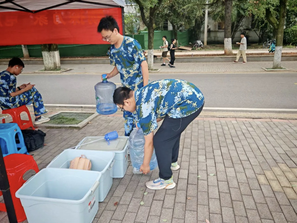 同学们刻苦训练的同时,学院也构筑了坚实的后勤保障防线。军训伊始,学院领导、新生班主任和辅导员们便每日深入训练场,亲切慰问参训学生与教官,为大家加油鼓劲。学院特别设立了“物理与电子科学学院军训服务点”,备足了充足的饮用水、防暑药品和应急物资,为同学们提供最及时的能量补充和健康守护。这份来自学院的默默守护,如同炎热天气里的一缕清风,给予了同学们坚持到底的强大动力,让他们深刻感受到物电大家庭的温暖。