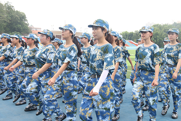 训练场上,在教官的指令下,同学们双脚迅速并拢、膝盖绷直,转体时身体如轴般平稳,动作干脆利落,没有一丝拖沓。从稍息、立正到向左转、向右转,每一个转体角度都需精准到90度,每一次落脚都要与地面形成整齐的叩击声。在队列训练中,摆臂的幅度、抬脚的高度、步伐的间距,都在反复训练中趋于一致。行进时,前后同学的距离始终保持在一臂之间,左右同学的脚尖几乎在同一条直线上。当“立定”的口令响起,整个队列瞬间静止,这整齐的步伐背后,是无数次的磨合与校准,是个人融入集体的生动写照。