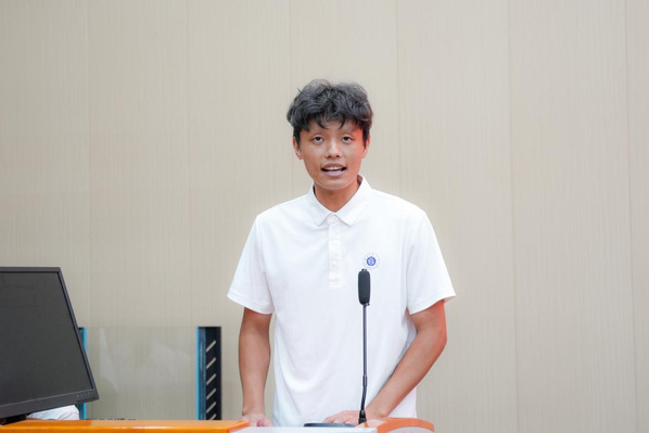 新生代表2501班杨博同学在发言中表达了初入大学的激动与憧憬。他号召全体新生尽快适应环境,学会独立与共处;主动学习,实现全面发展;并心怀家国,勇担青年使命,用奋斗书写无愧于时代的青春篇章。