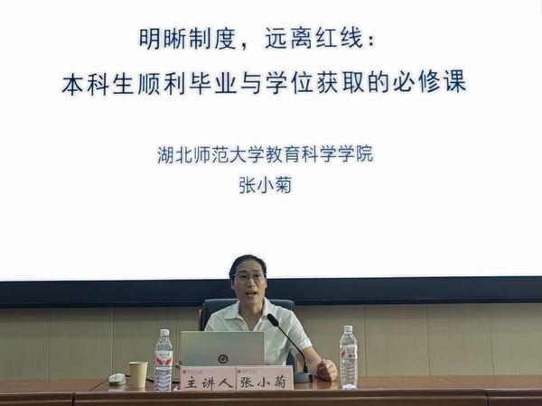 张小菊介绍了学士学位授予细则的最新改动,强调学习新的学士学位授予细则的重要性,并分别从学士学位授予条件、不能授予学士学位情况、破格授予学士学位情况、学士学位授予程序四个方面详细阐述了学士学位细则的内容。她希望同学们可以在大学生活中提升个人素质,培养个人工作能力,团结协作,明确人生目标与未来发展方向,做好职业规划,遵守校纪校规,共同营造良好的校园氛围。