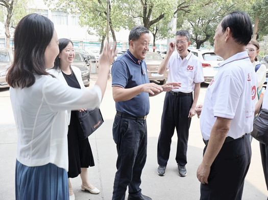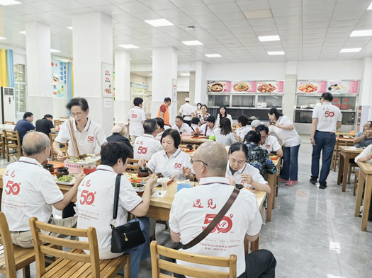 座谈会结束后,校友们在师生陪同下参观了校园,重点观看了外国语学院发展成就文化墙,并在人文楼前合影留念。随后,大家前往食堂用餐,校长雷儒金和校纪委书记陆咏梅特地前来问候校友。餐后,校友们还走访了昔日的教学楼所在地,感受母校的发展变迁。