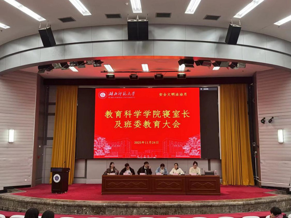 为强化班委责任担当,规范寝室管理,营造和谐有序的校园生活环境,教育科学学院于11月24日晚上在教育大楼报告厅举办寝室长及班委教育大会,辅导员秦姗姗、刘丽娟、夏青腾、夏木斯亚、吕经纬,学生会权益部部长胡思恬,29栋楼长郭苹葳及全体寝室长,各班班长、学习委员、团支书参会。会议由权益部干事庞惠心主持。