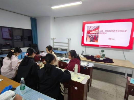 随后开展分组讨论,各班以“材料科学研究如何对接国家需求”为核心议题开展情景式研讨。同学们结合所学专业,从新能源材料研发、电池技术突破、高端装备材料创新等角度各抒己见,探讨科研方向与国家战略科技力量的契合点。讨论结束后,各班级凝聚形成“材料担当”总结感悟,明确将以实际行动回应国家需求、助力学科发展。