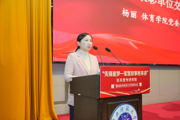 体育学院党委副书记杨丽作为征兵工作先进单位代表做经验交流。她回顾了学院在征兵工作中的付出与收获,分享了为学生“搭桥”精准对接需求、一对一沟通服务的工作方法,并表示将继续做实做细工作,为学子追梦之路保驾护航。