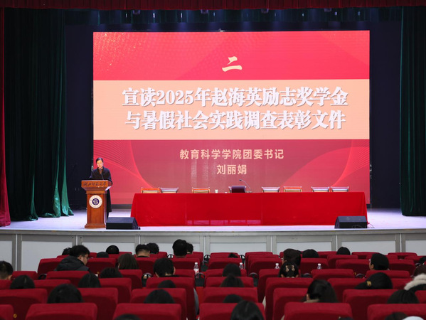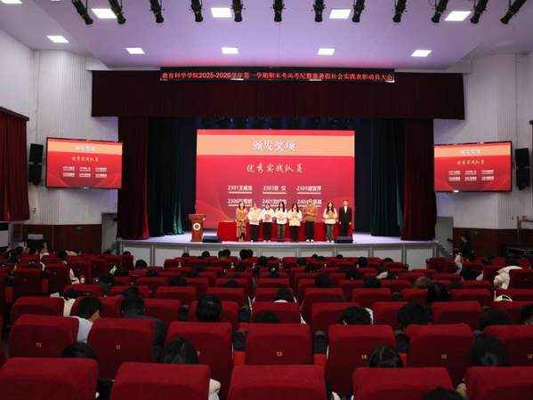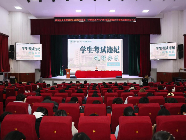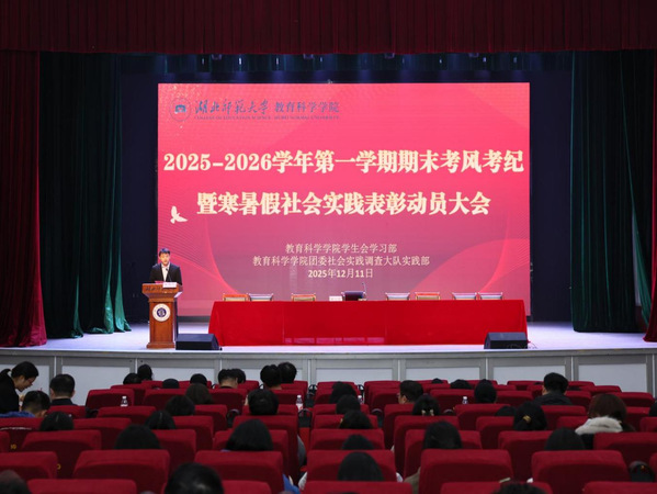 为筑牢诚信考试防线,营造公平公正的考试环境,鼓励学生参与社会实践,12月11日下午,教科院在大礼堂召开2025-2026学年第一学期期末考风考纪暨寒暑假社会实践表彰动员大会。教育科学学院党委副书记刘广兵,副院长张小菊,学工办主任秦姗姗,团委书记刘丽娟,辅导员夏青腾、夏木斯亚、吕经纬,25级各班班主任。各年级学生代表及全体24、25级本科生、研究生参会,会议由吕经纬主持。