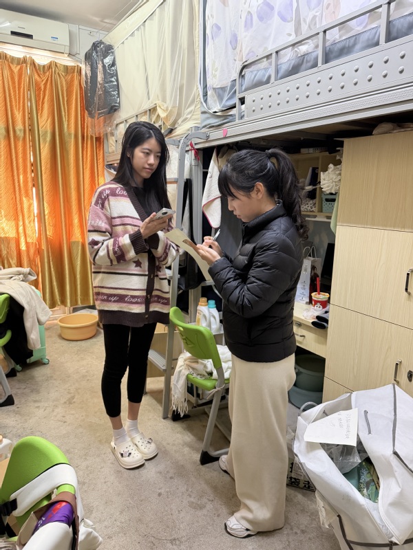 刘懿钊与辅导员们逐间走访暂缓离校学生宿舍,与同学们亲切交流,细致询问大家的生活、饮食和学习状况。刘懿钊重点检查了各寝室用电安全与消防隐患,结合近期校园安全案例,反复叮嘱同学们务必遵守宿舍管理规定,严禁使用违规电器、杜绝明火,并提醒大家离寝时注意断电、锁门,共同维护安全有序的住宿环境。他还鼓励同学们合理安排假期时间,保持良好作息,利用寒假积极充电,提升专业技能,实现“假期不虚度、成长不停步”。