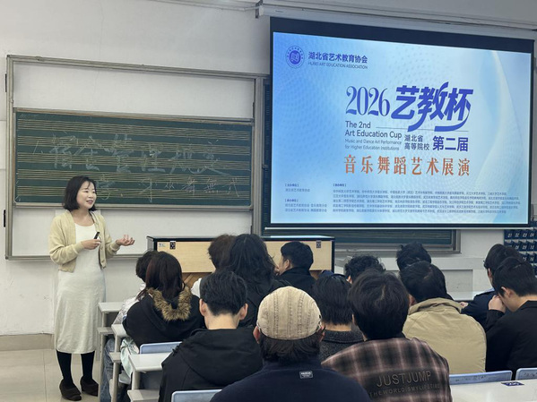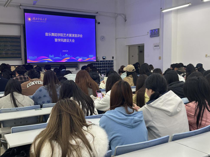 为深入贯彻落实立德树人根本任务,进一步加强学院学风建设,引导学生以赛促学、以学促行,3月26日下午,音乐舞蹈学院在13307教室举办艺术展演宣讲会暨2026年学风建设大会。本次会议邀请了湖北省艺术教育协会音乐及舞蹈教育分会秘书长韩学晨担任主讲,学院党委副书记刘易斯、音乐表演系主任蒲实、辅导员老师李融冰以及各年级学生代表百余人参加。